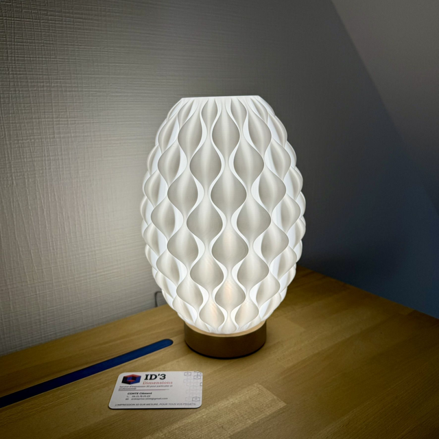Laissez-vous séduire par Alvéoles, une lampe sculpturale au design inspiré des formes naturelles et fluides. Imprimée en 3D et posée sur un socle en bois de hêtre, elle se distingue par ses courbes ondulées qui forment un motif évoquant des alvéoles, tout en légèreté et en mouvement.